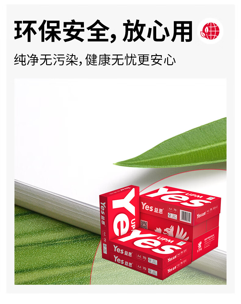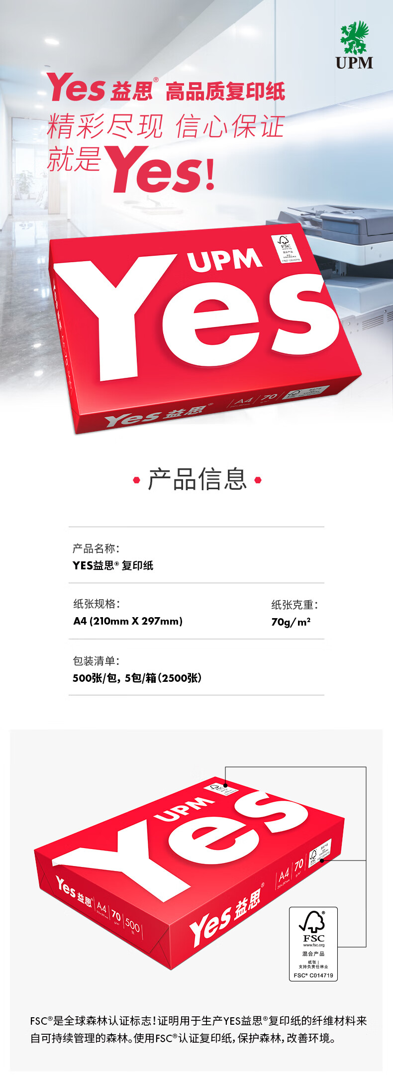 UPM红益思 70g A4打印纸 全木浆复印纸 500张/包 5包/箱(2500张)