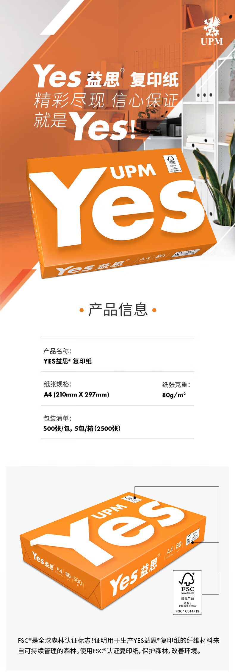 UPM橙益思 80g A4打印纸 复印纸 加厚款 500张/包 5包/箱(2500张)